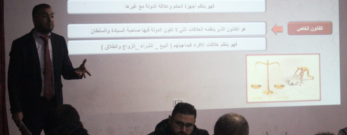 المحاضرة قدّمها القاضي فراس محمد وتضمّنت الحديث بشكل مختصر عن نشأة القانون في العصور القديمة حتى وصوله للعصر الحديث، والتطور الكبير الذي حل بالقوانين والتشريعات، كما تحدّث القاضي عن مصادر القانون، وغايته، لبناء المجتمعات، والعدالة على أساس القانون، لا على أساس أمور أخرى، وفي نهاية المحاضرة دار نقاش مع الحضور حول أثر القانون في حياة الفرد، وبناء المجتمع، وآليات تطبيق القانون على جميع الأفراد بشكل عادل.