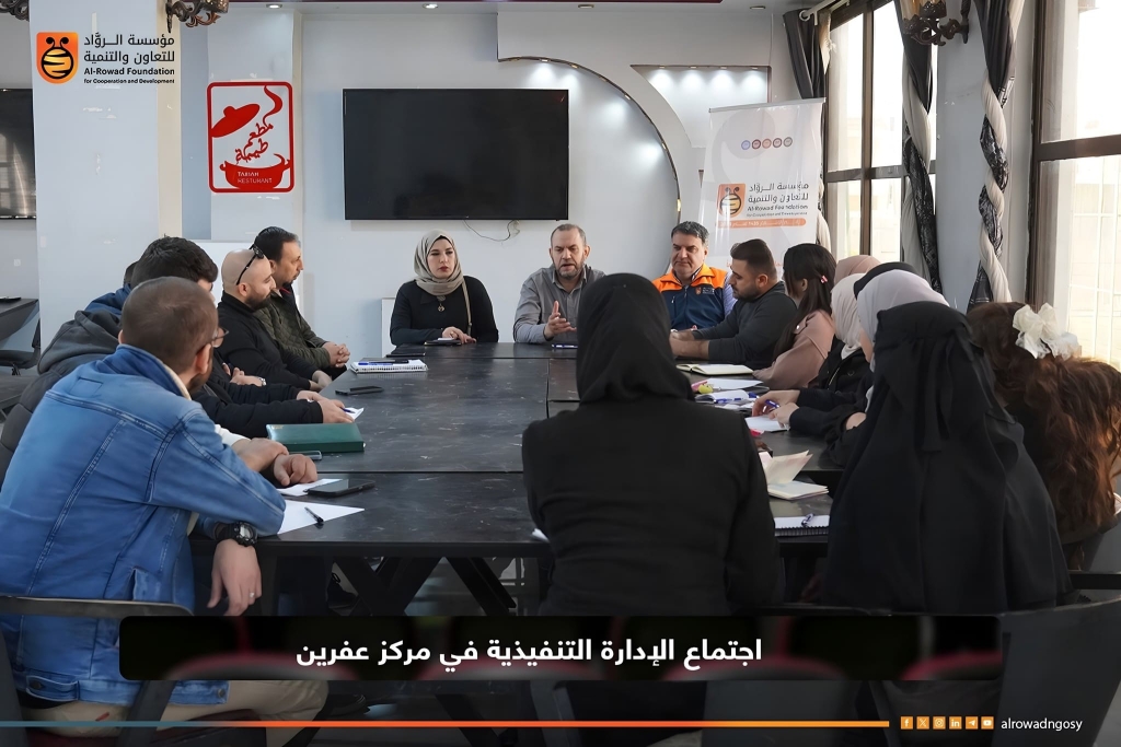 عقدت الإدارة التنفيذية اجتماعاً مع إدارة مكتب عفرين ومسؤولي المشاريع والعمليات، جرى خلاله استعراض أبرز التحديات التي تواجه سير العمل، ومناقشة المقترحات العملية الهادفة إلى تطوير المشاريع وتحسين جودة الخدمات المقدّمة للمستفيدين.